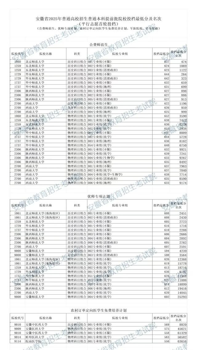 刚刚,安徽省教育招生考试院公布2025年普通高校招生普通本科提前批院校投档线,6所招收国家公费师范生的院校最低投档线高达622分,超过特控线一百多分,而军校最低也要579分,公安政法类院校最低547分。