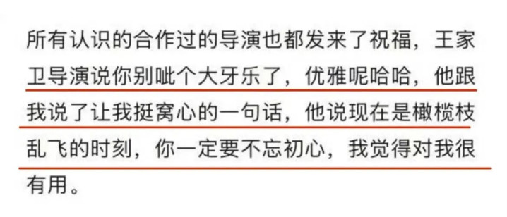 在一片祝贺声中,王家卫发来一句忠告,他先是开玩笑的说,要保持优雅,然后语重心长的嘱咐辛芷蕾: