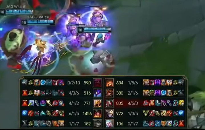 SKT在那局比赛的优势很大,40分钟双龙汇推上了高地,后续还拆掉了两座门牙塔,但由于希维尔的清线能力太强了,他们就是无法一波拆掉JAG的基地。哪怕是大龙Buff强化的超级兵,遇到六神装的希维尔也被很快清掉,他一人吃三路兵线,94分钟有1456刀确实夸张,队友阿兹尔的补刀也不过是771刀,对位Bang的伊泽瑞尔在出了电刀后也只是972刀。