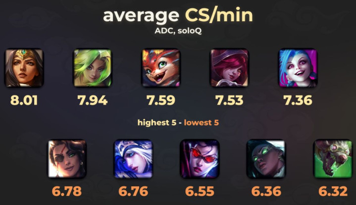 Sara直接上最终答案,最快的5个ADC英雄是希维尔、泽丽、斯莫德、霞、金克丝;最慢的5个英雄是莎弥拉、艾希、薇恩、赛娜和图奇。我们可以发现,那些补刀能力强的英雄往往在职业赛场上有更高的出场率,尤其斯莫德走中单位置的话会更加恐怖,Chovy和Zeka都能做到20分钟接近250刀。
